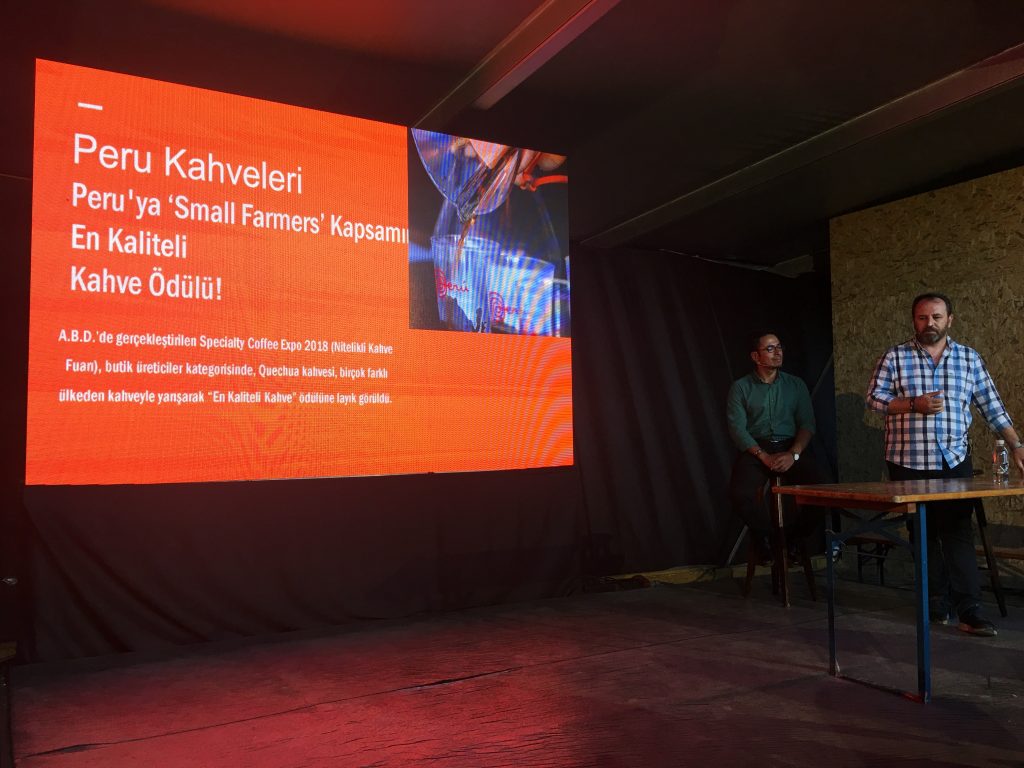 Hugo Guevara’nın sunumuna deneyimlerini anlatmak için Del Fiano’nun sahibi Fatih Topuz da katıldı. Del Fiano Trkiye’nin en büyük yeşil çekirdek ithalatçılarından. Hal böyle olunca kendisi Peru‘ya davet edilmiş ve gittiğinde kendisi için verimli bir ziyaret planı oluşturulmuş. Burada yaşadığı deneyimlerden bahseden Fatih Topuz’un bir kaç cümlesi oldukça dikkat çekiciydi. Bazı ülkelerde kahve verilerinin hatalı geldiğini, örneğin rakım 1600m yazılan kahve çiftliğini ziyaret edip kendiniz ölçtüğünüzde 1200m çıktığından bahsetti. Peru‘da hiç böyle bir durumla karşılaşmamış. Üstelik Peru‘da yetişen Gesha türü çekirdeklerin panama çekirdeklerinden çok daha lezettli ve ciddi anlamda da ucuz olduğundan bahsetti. İşin özü nitelikle Peru kahvesi bulursanız ve hatta Gesha tipi bir kahveyse bulduğunuz yerde mutlaka tadın!