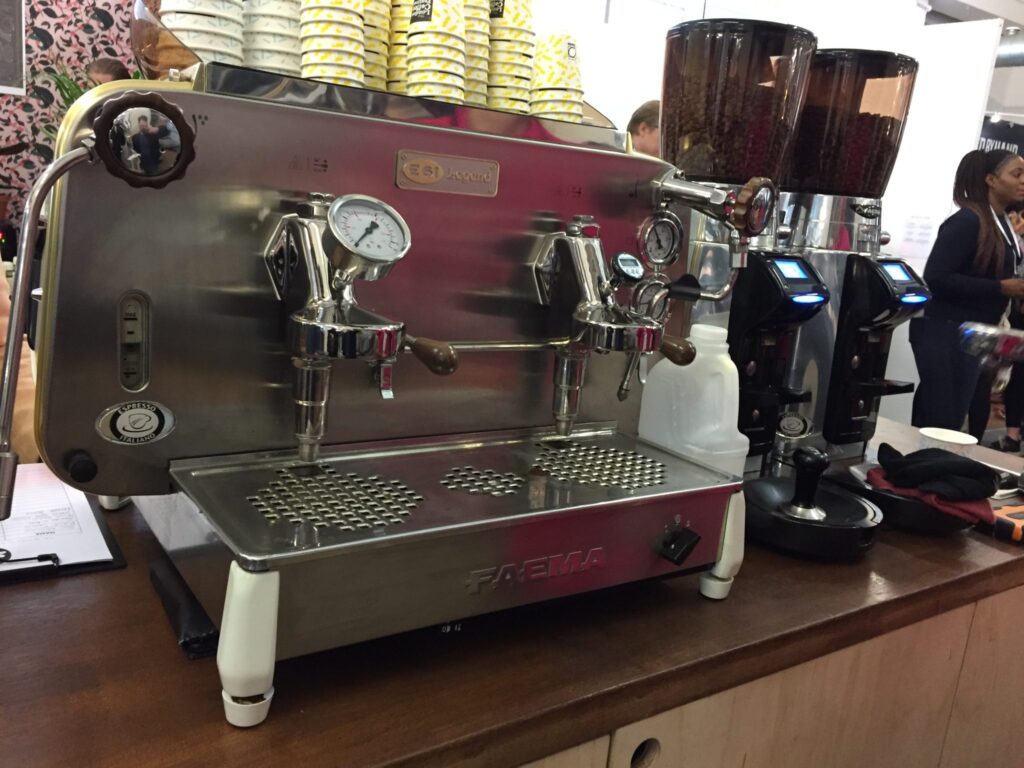 Buradan ayrılıp Londra Kahve Festivali gezintime devam ederken Faema E61 makinesinden de kahve içmeden edemezdim ve buradaki baristadan da kendim yapmayı rica ettim. Kendisi kabul ettikten sonra “Basıncı 9 bar yapıyorum, 15 bar olmasın” deyince anladım ki basıncı arttırmak makine üretecileri için çok havalı bir durum oluştursa da baristalar klasik kalmayı tercih ediyorlar.