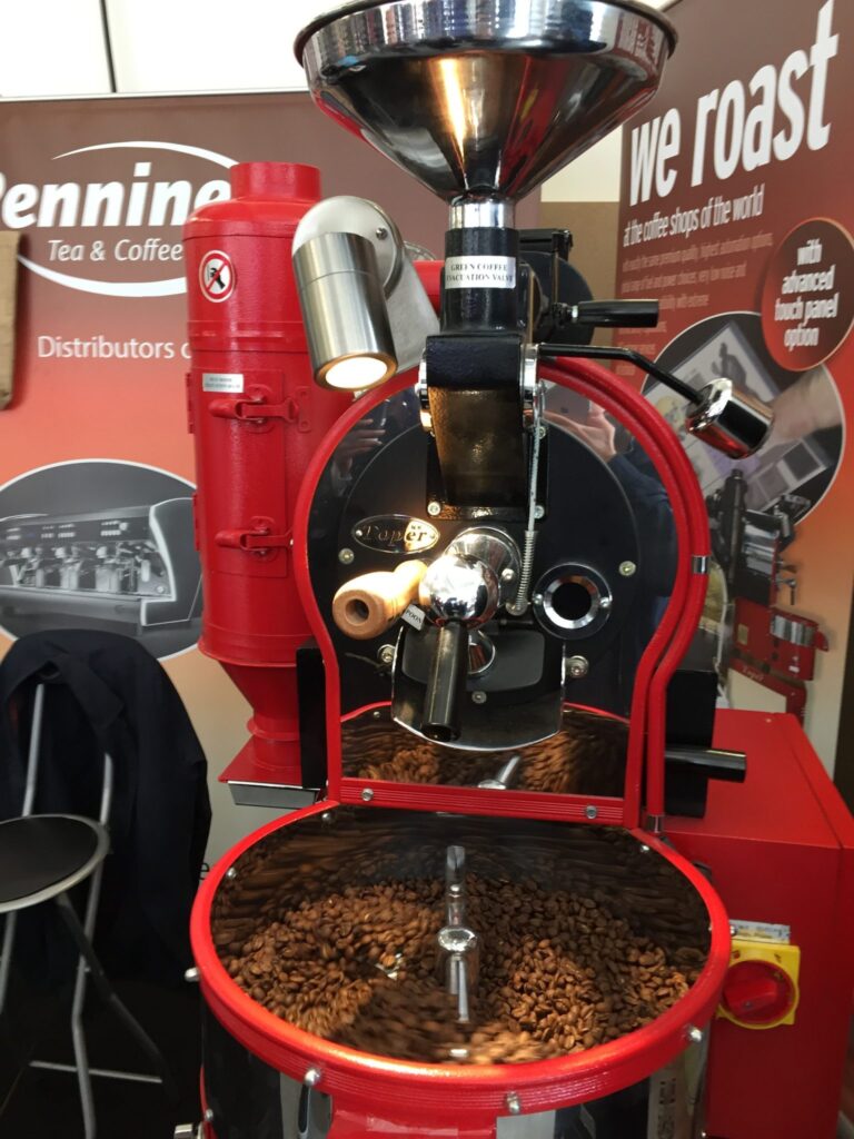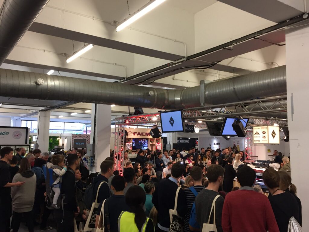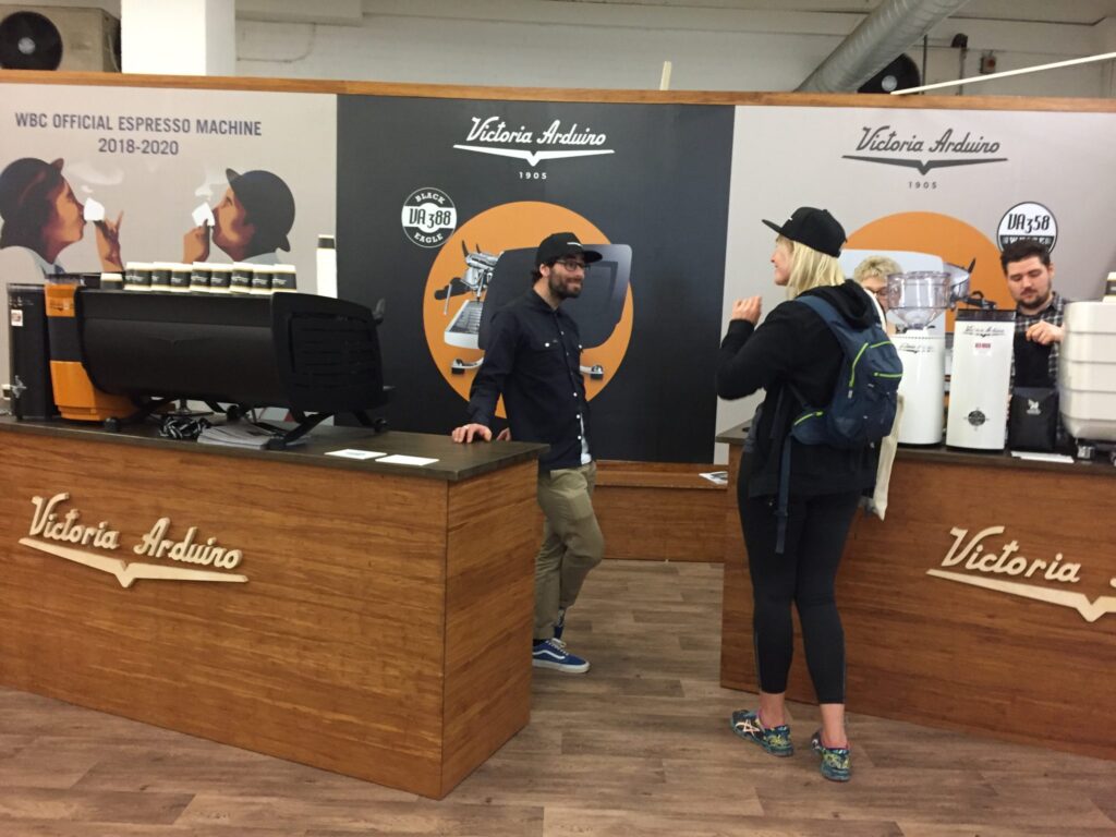 Bu esnada hemen yanda yer alan modern makine o kadar moderndi ki hiç özen göstermedim bilgi almak için. Pistonlu Victoria Arduino olarak aklımda yer etmeliydi efsane. Sanırım bu andan sonra başka makinenin ilgimi çekeceğini fark ettim ki fazla zaman harcamadım makineler üzerinde. Endüstriyel kavurma makinelerinin yanında geçen sene ufacık bir standı olan ve bir masacık üstünde makineyi yerleştiren evde kavurma makinesi üreticisi Ikawa’nın bu sene standı büyümüştü ve daha çok kişi ile daha profesyonel bir şekilde yer almışlardı.
