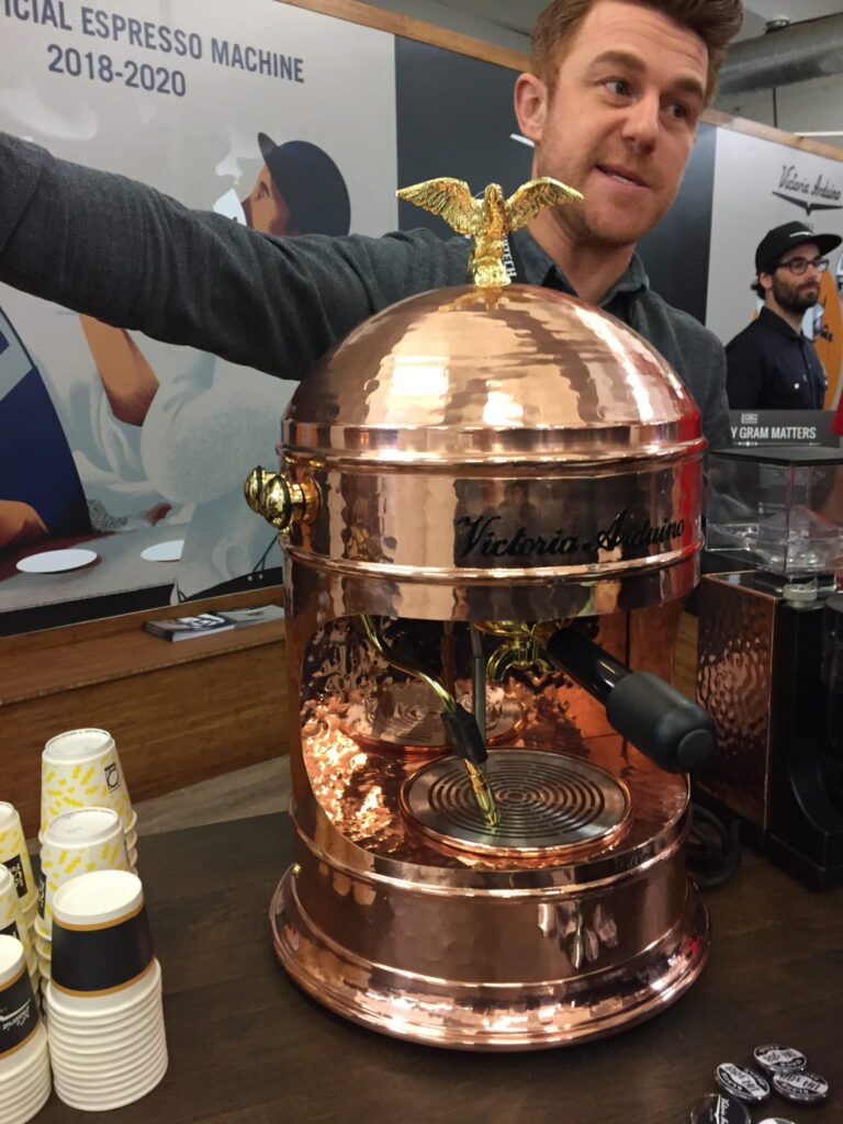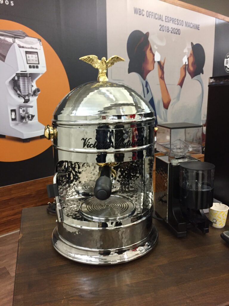 Gezintime çalan canlı müzik eşliğinde devam ederken karşıma çıkan makine karşısında dondum kaldım. Karşımda bir efsane makine vardı. Espresso makinelerinin en klas, en klasik olanı Victoria Arduino karşımdaydı, hem de o üzerinde kartal işlemeli en klasik modelleriyle.